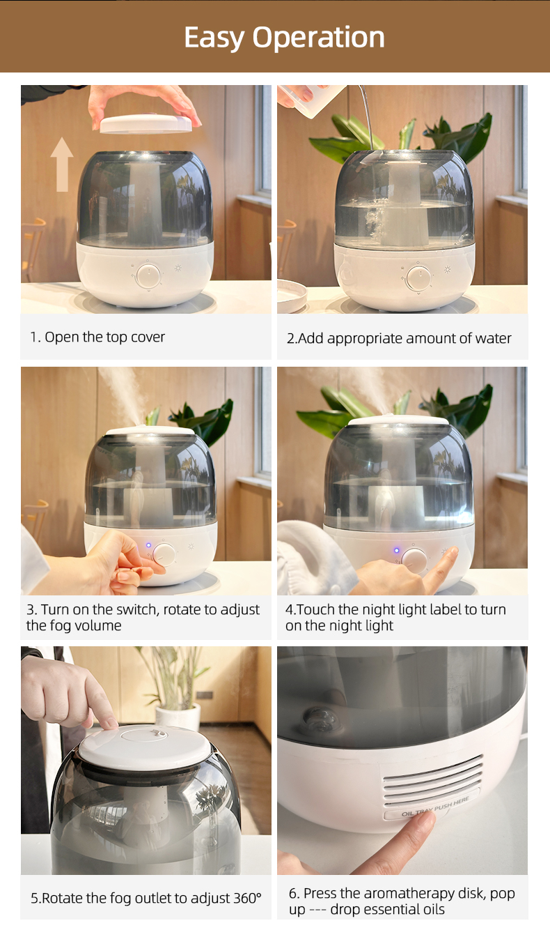 Vår nye ultralyd aromaterapi luftfukter stor 5L kapasitet elektrisk hjemmehotellbruk gjør bruken din tryggere og mer intim. Den er mykere enn vanlige luftfuktere og forstyrrer ikke studiet, arbeidet og hvilen. Vanntanktoppfylling, praktisk og rask, gjennomsiktig vanntank, vannnivå kan sees. Nano-fin tåke 300 ml/t, maksimal tåke kan løpe 8 timer, minimum tåke kan kjøre 50 timer, kan legge til aromaterapi for å berolige humøret ditt. Luftfukterhuset er utstyrt med et uavhengig nattlys, slik at natten din er full av trygghet.